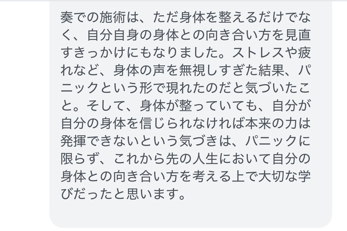 ストレスや疲れなど、身体の声を無視しすぎた結果、パニックという形で現れたのだと気づいたこと。