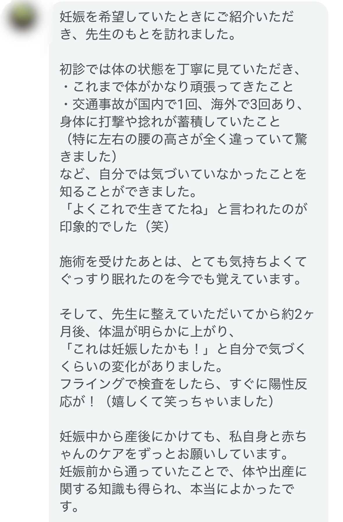 妊娠を希望していたときにご紹介いただき、先生のもとを訪れました。